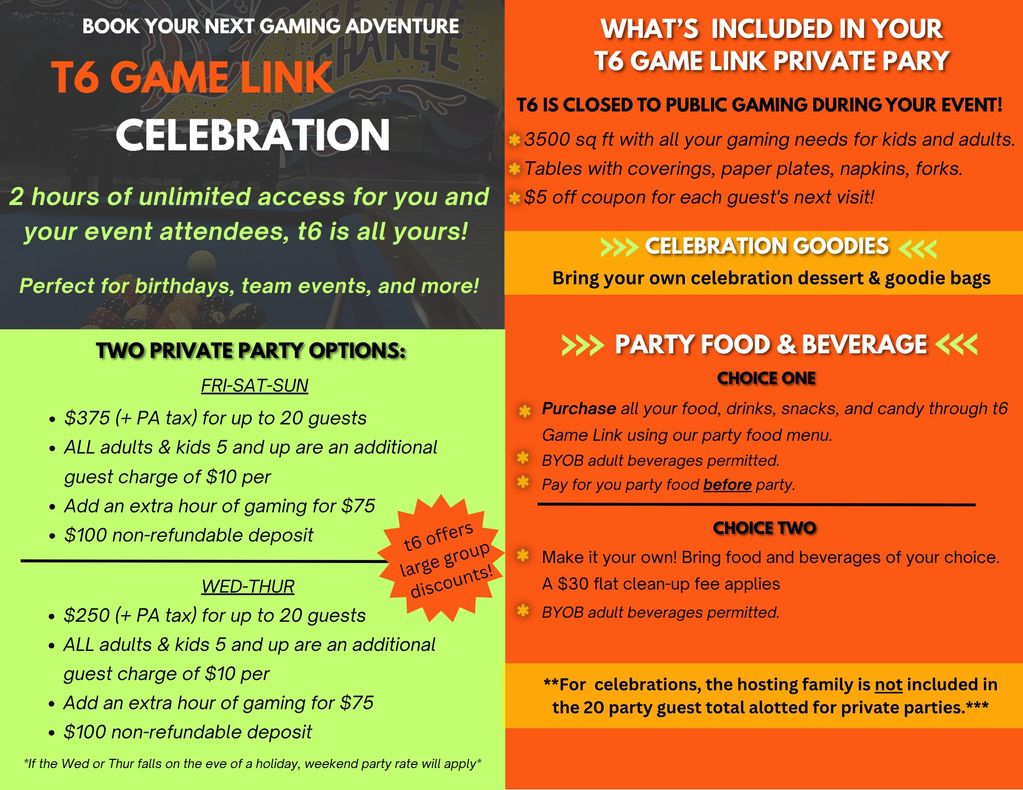 As a family business, t6 Game Link is always adapting to meet then needs of our community. Please take a moment to see some of our private party changes. If you have a large group please reach out to us to inquire on your large group discount!